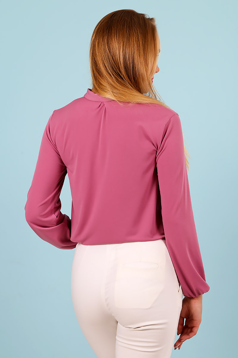Лаконичная, яркая, элегантная женская блузка розового цвета с длинным рукавом и декоративным бантом.