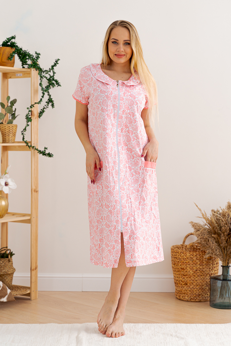 Удобный женский хлопковый халат на молнии с поясом, с коротким рукавом, отложным воротничком и с накладными карманами, белого цвета с набивкой — огурцы.